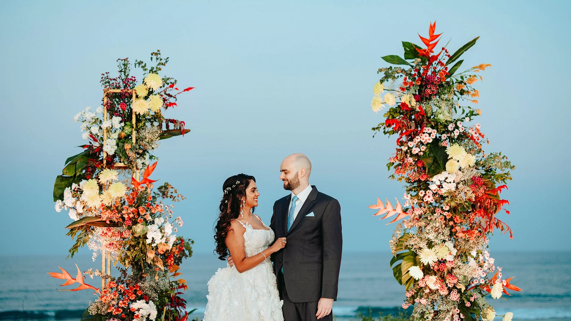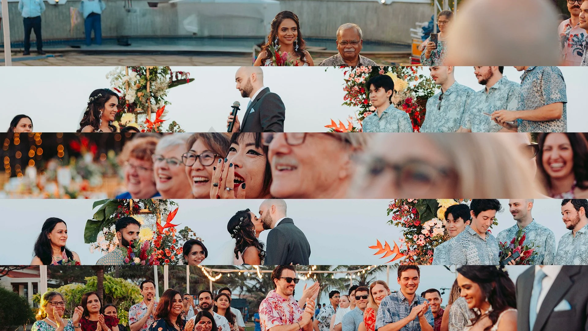 Following the ceremony, the celebration moved to a lively reception. The evening was a kaleidoscope of colors, music, and laughter as guests from different parts of the world mingled and celebrated. The couple stole away for some intimate sunset portraits by the sea, the golden light perfectly capturing the joy of their special day. These moments of quiet reflection amidst the festivities highlighted the deep bond they share. Back at the reception, speeches were given, toasts were raised, and the dance floor was packed with guests celebrating the happy couple. It was a night filled with "scheduled fun," hand-holding, and the kind of family togetherness that the bride had promised to cherish.