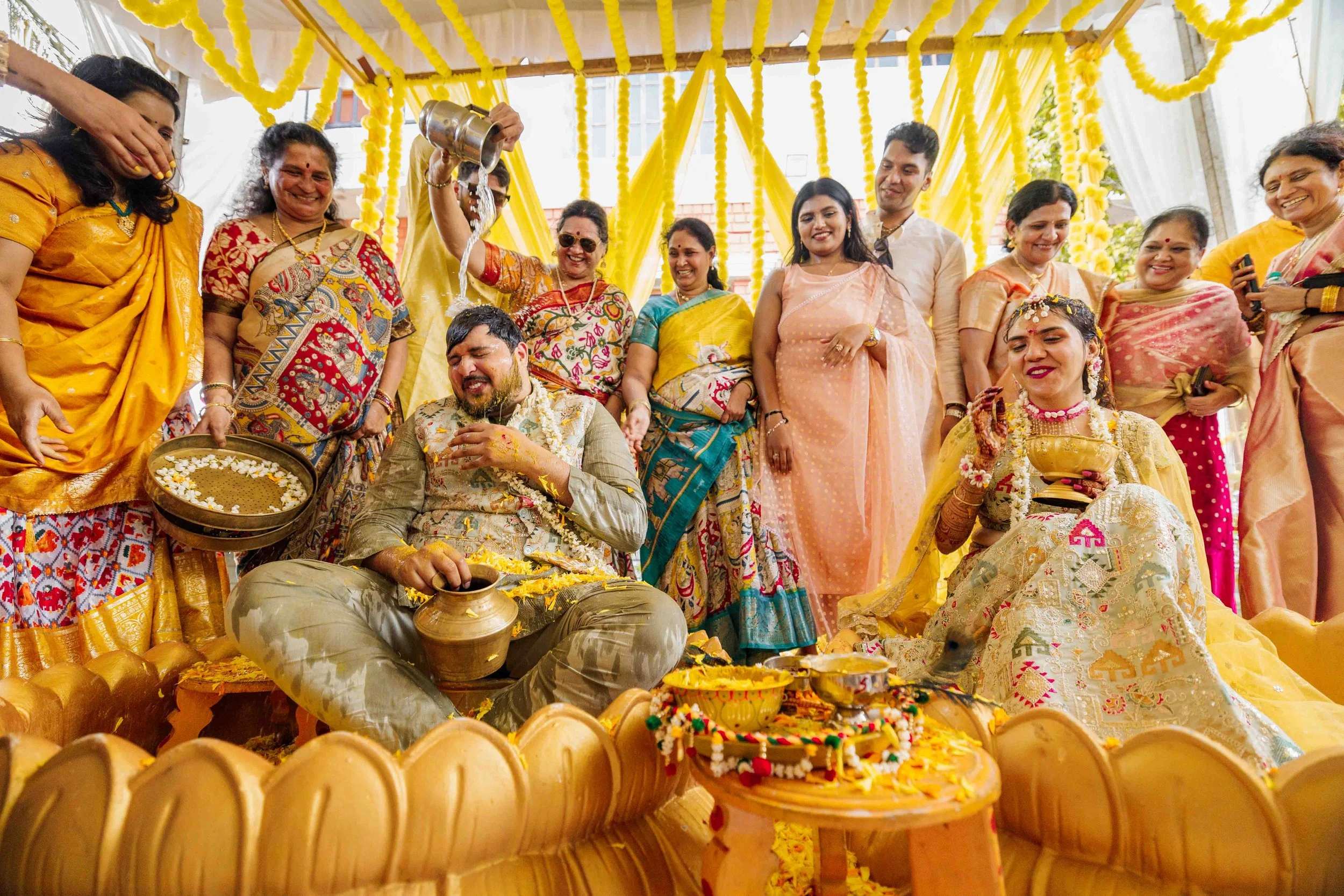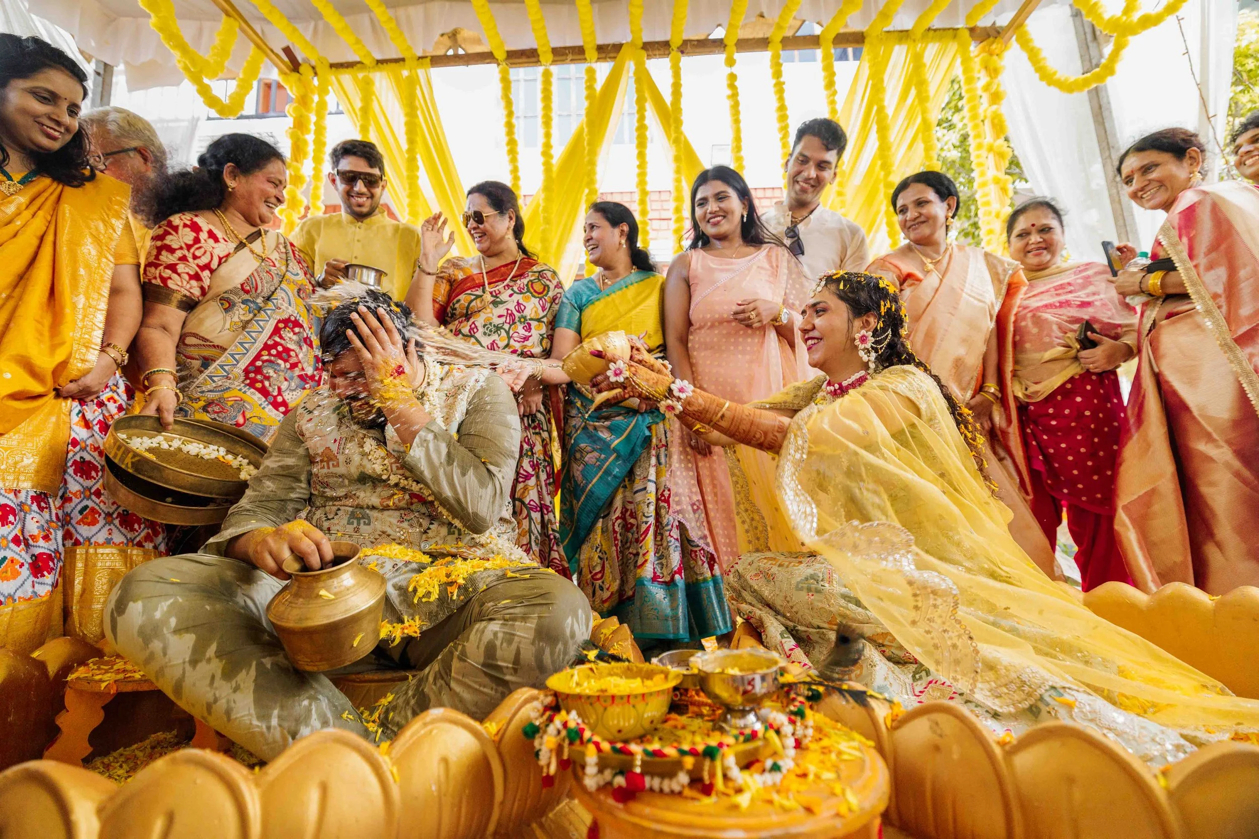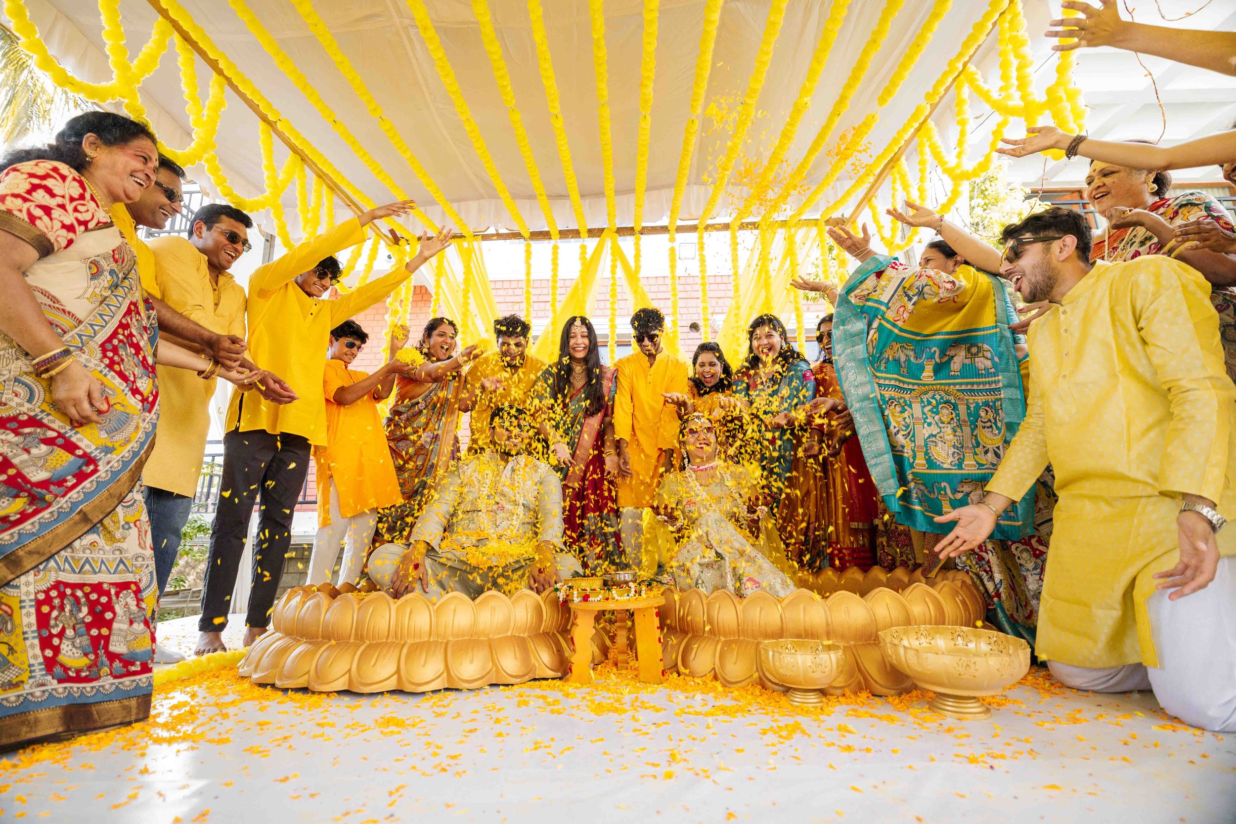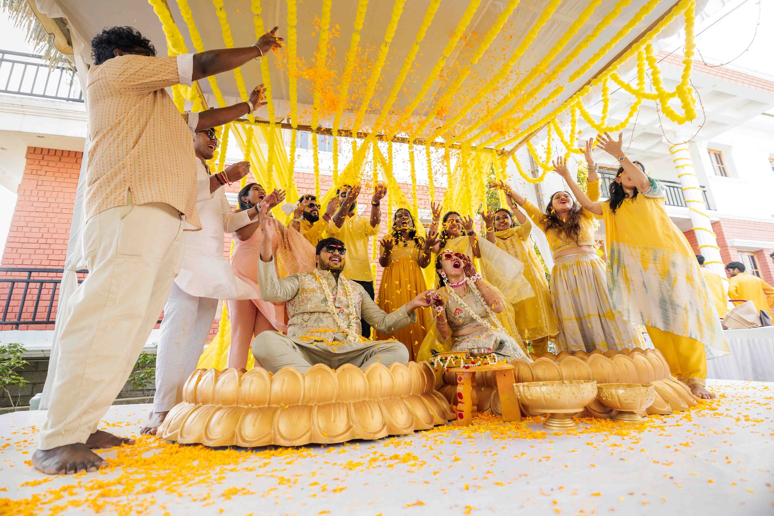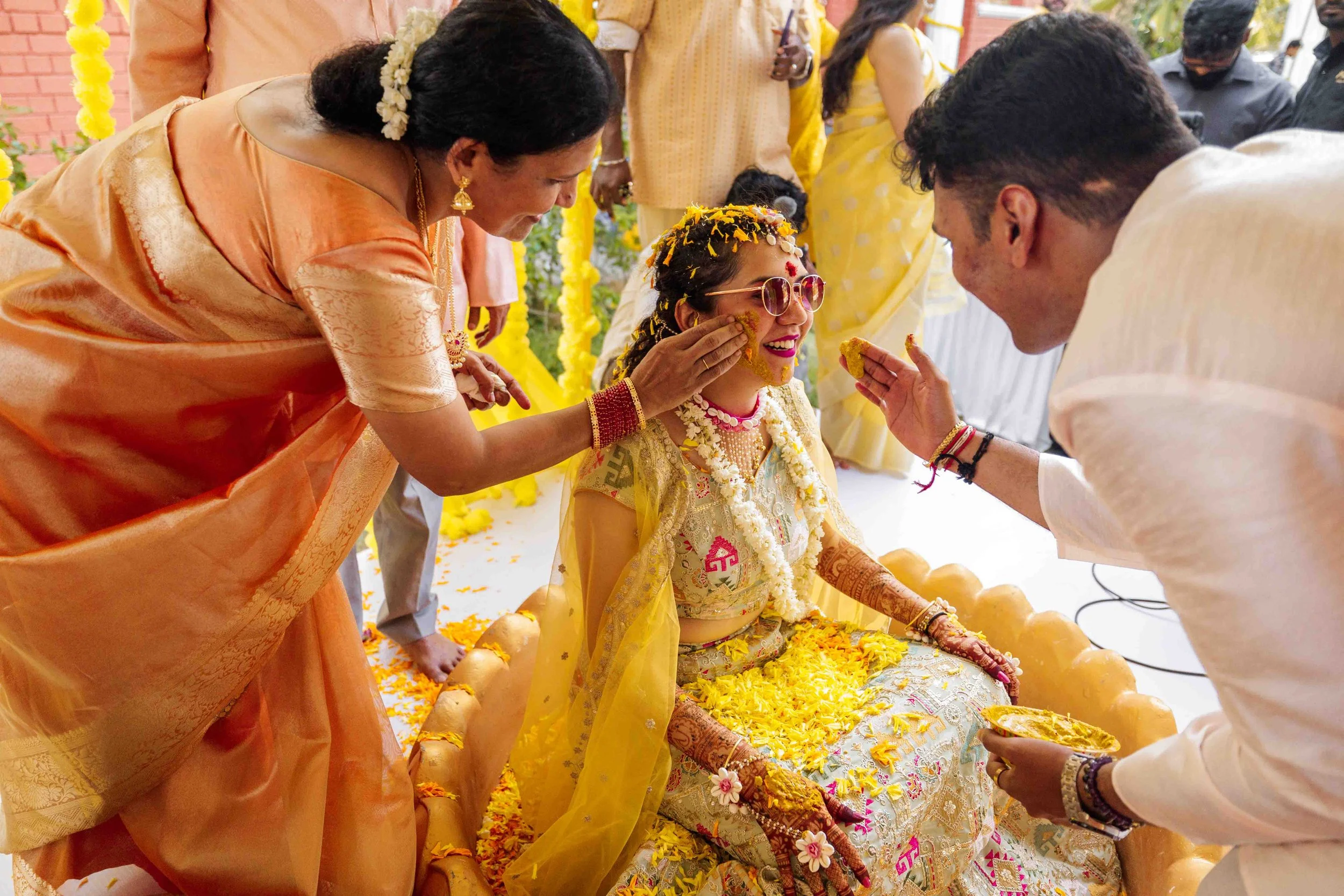 A Golden Day of Joy, Captured by Moments From Heaven Celebrating playful traditions, radiant laughter, and love glowing in golden hues Amirtha and Shyam's Haldi ceremony was a vibrant embrace of both tradition and playful warmth. Dressed in sunshine-hued attire and surrounded by loved ones, the couple was showered with turmeric, laughter, and live celebration, each moment glowing with energy and affection. The decor, awash in marigold tones, set a dreamy scene, petals in the air, turmeric-smeared smiles, and families coming together in a shared moment of joy. As the Haldi paste was lovingly applied, every giggle and teasing glance felt like a promise of forever. Captured by Moments From Heaven, these images go beyond ritual, they transport you into the heart of a love story painted in gold, laughter, and memory.