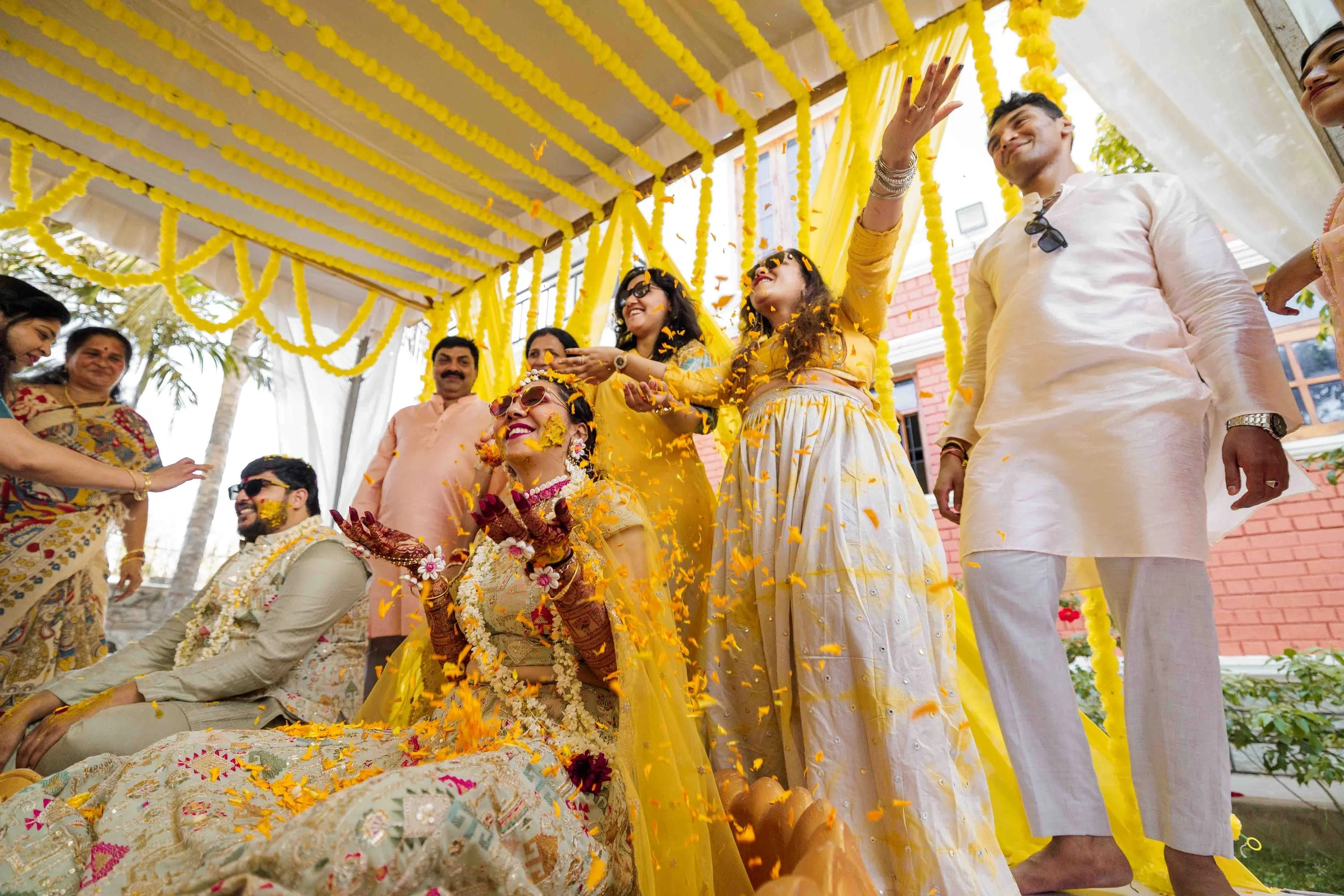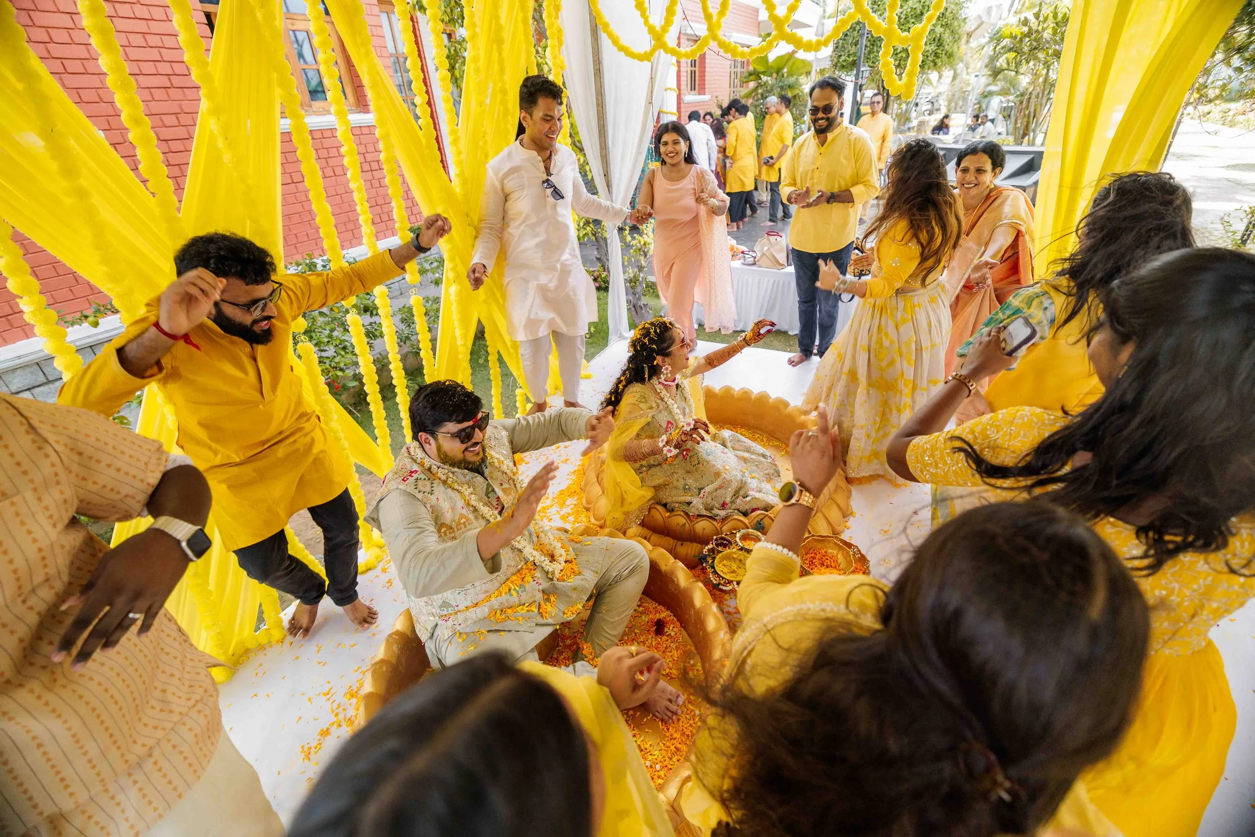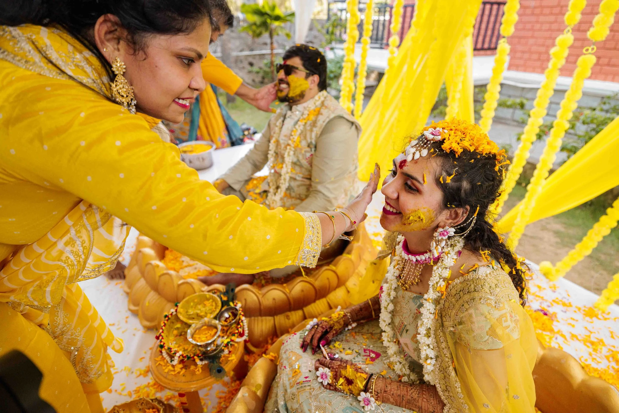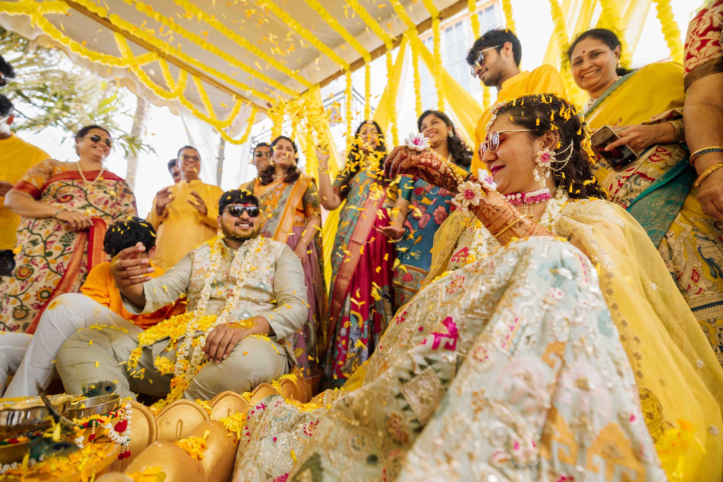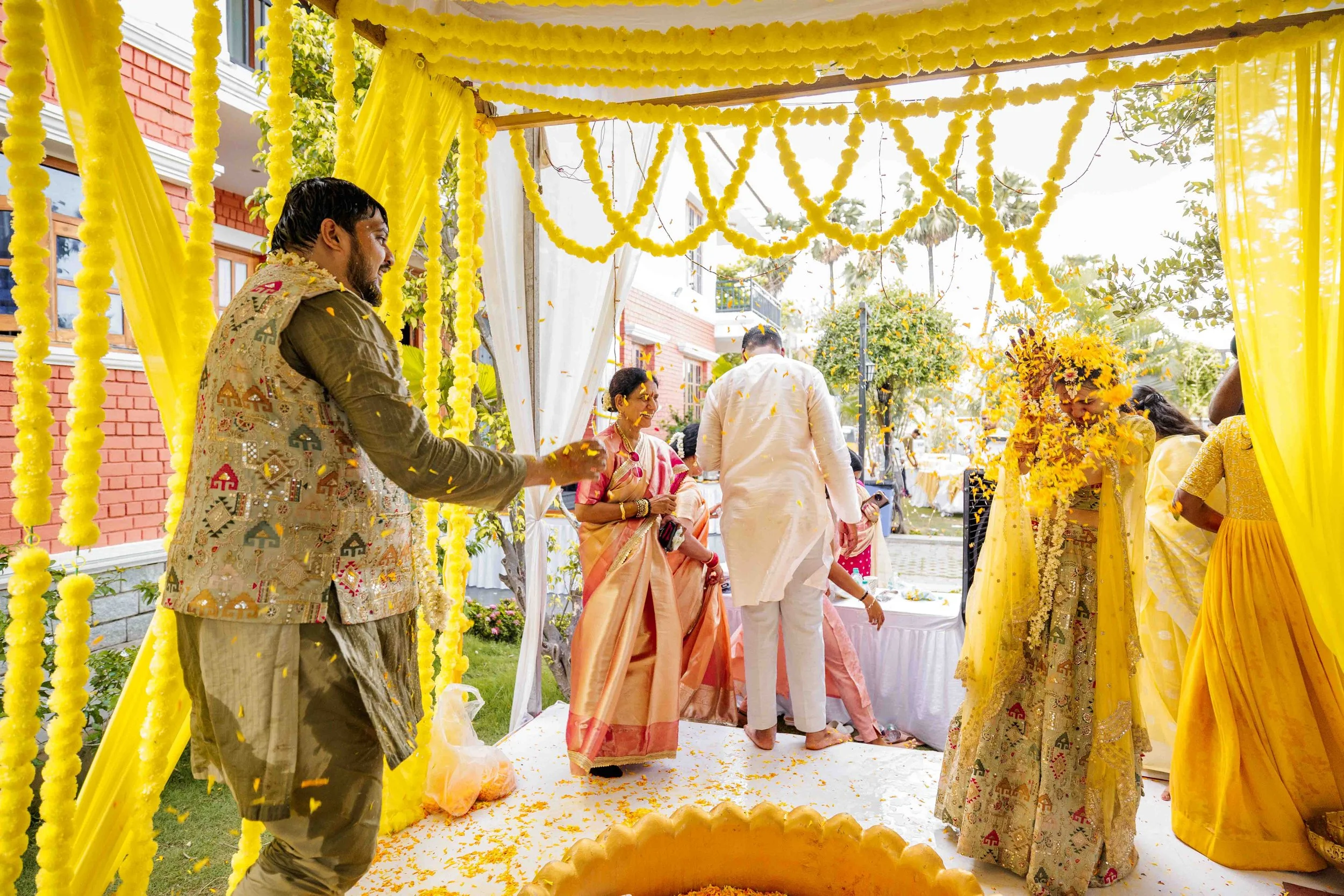 A Golden Day of Joy, Captured by Moments From Heaven Celebrating playful traditions, radiant laughter, and love glowing in golden hues Amirtha and Shyam's Haldi ceremony was a vibrant embrace of both tradition and playful warmth. Dressed in sunshine-hued attire and surrounded by loved ones, the couple was showered with turmeric, laughter, and live celebration, each moment glowing with energy and affection. The decor, awash in marigold tones, set a dreamy scene, petals in the air, turmeric-smeared smiles, and families coming together in a shared moment of joy. As the Haldi paste was lovingly applied, every giggle and teasing glance felt like a promise of forever. Captured by Moments From Heaven, these images go beyond ritual, they transport you into the heart of a love story painted in gold, laughter, and memory.