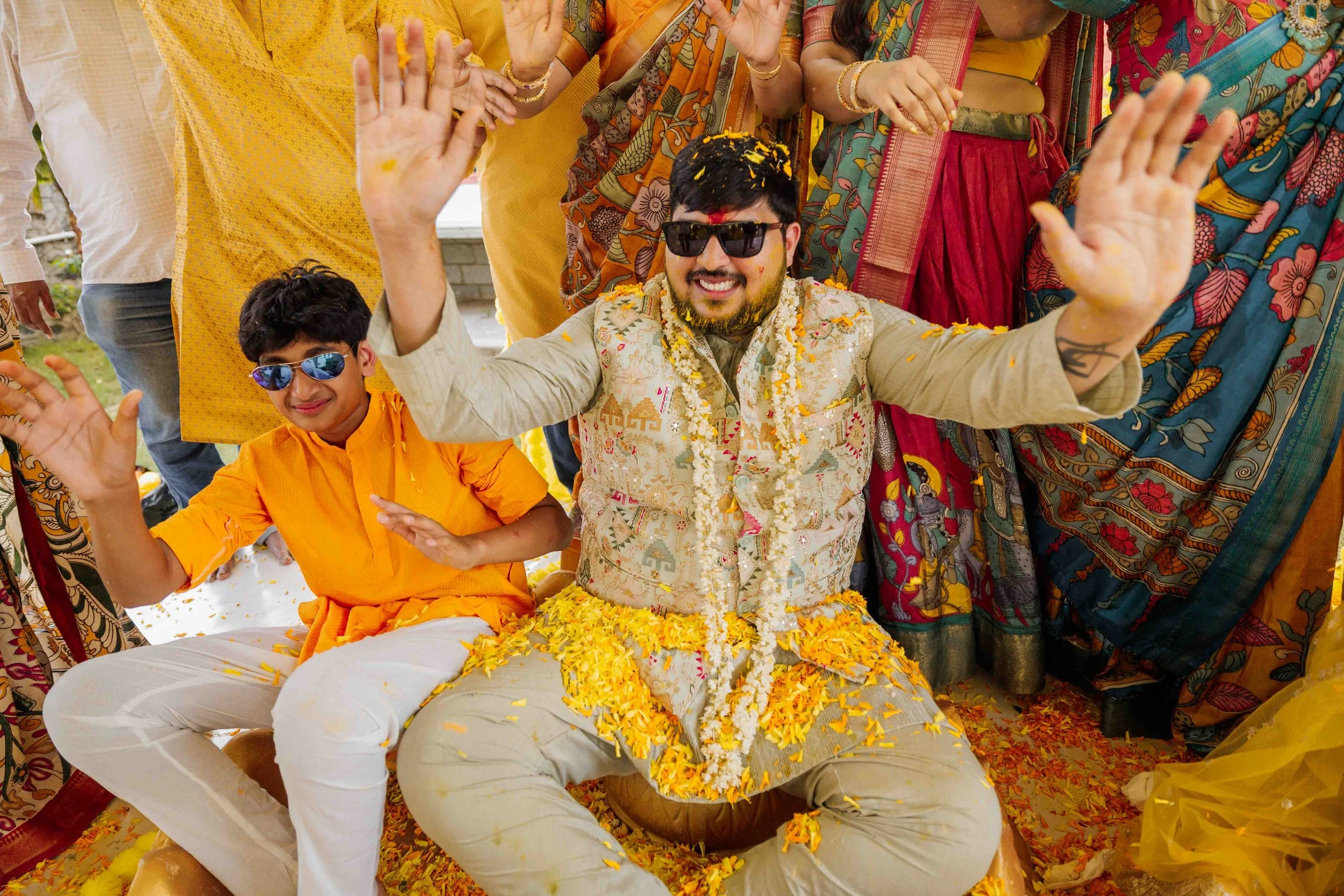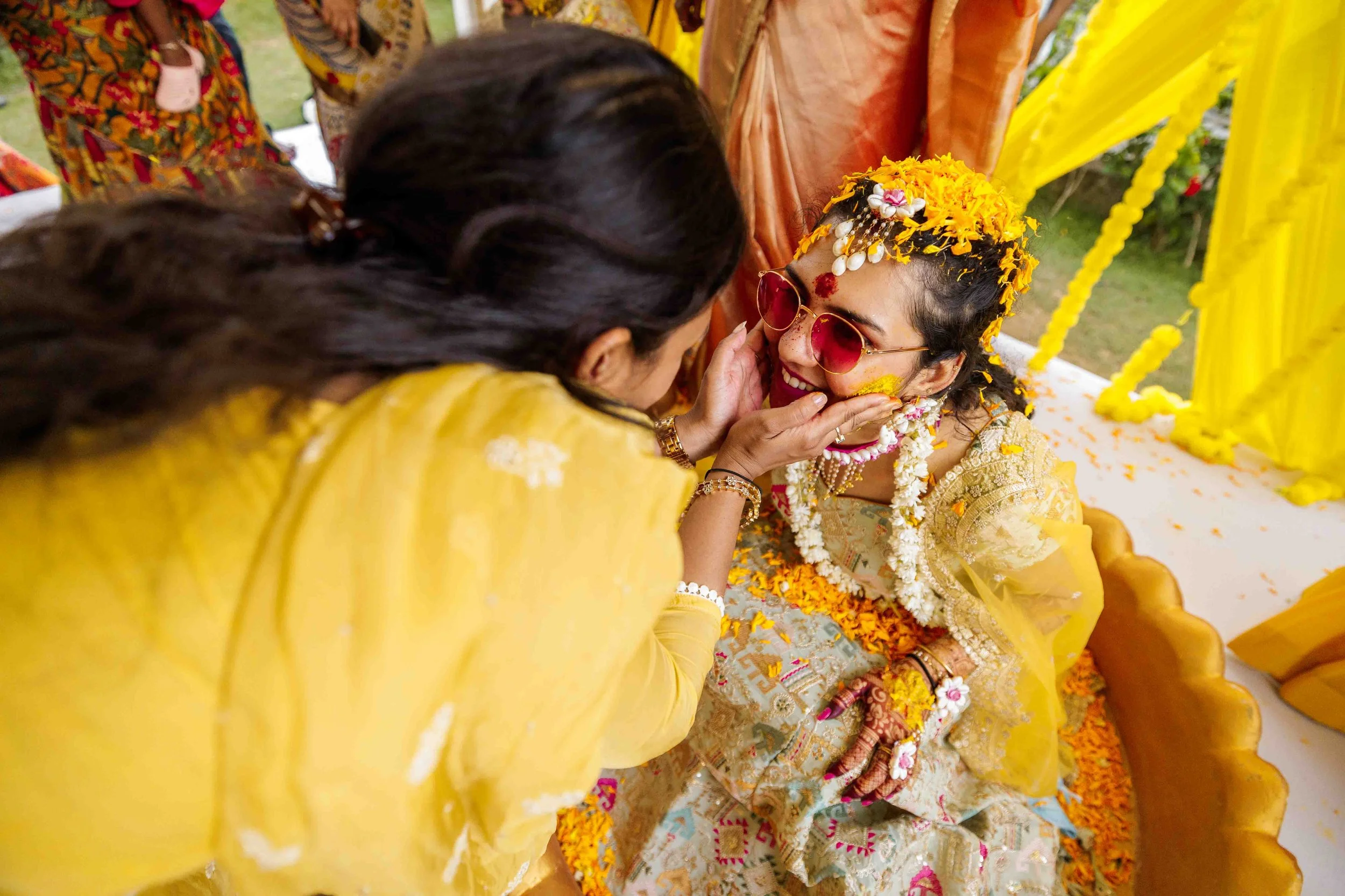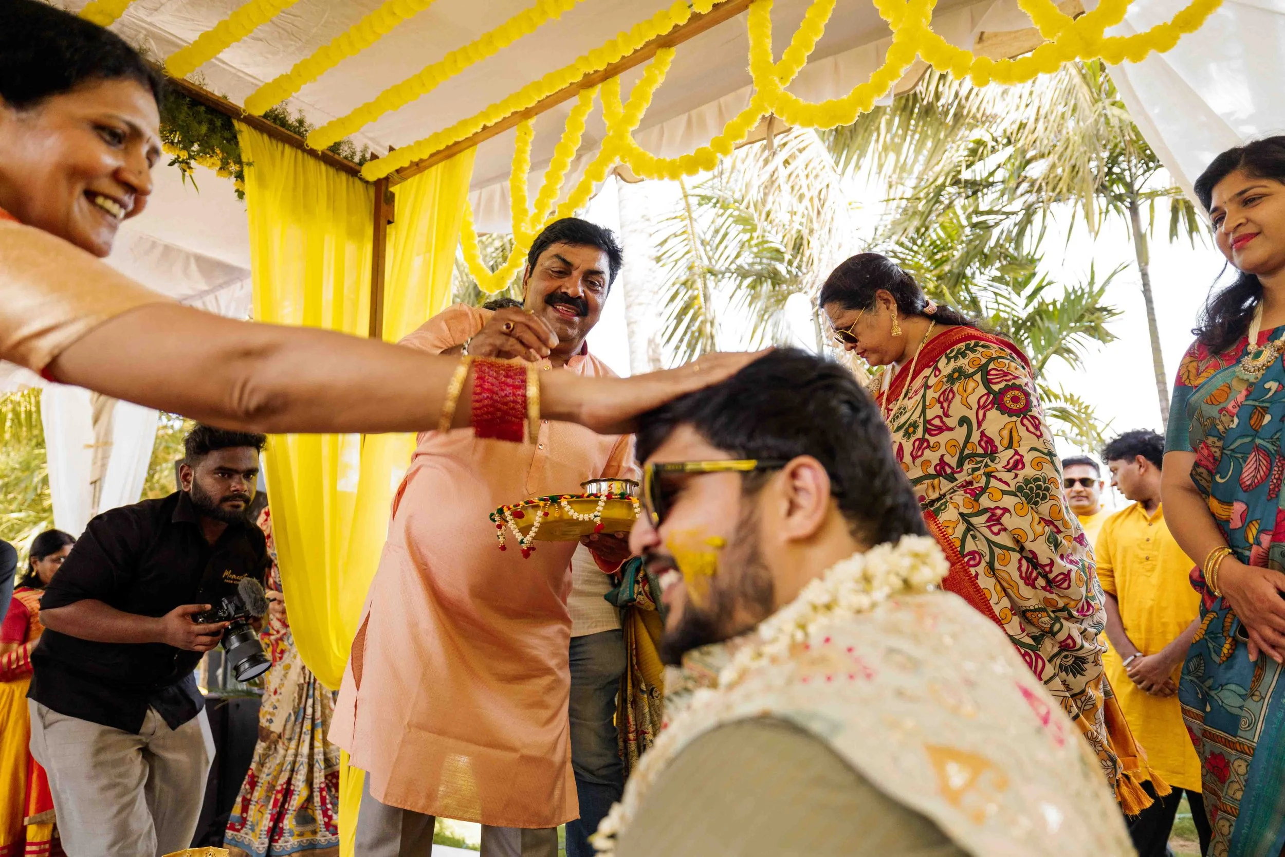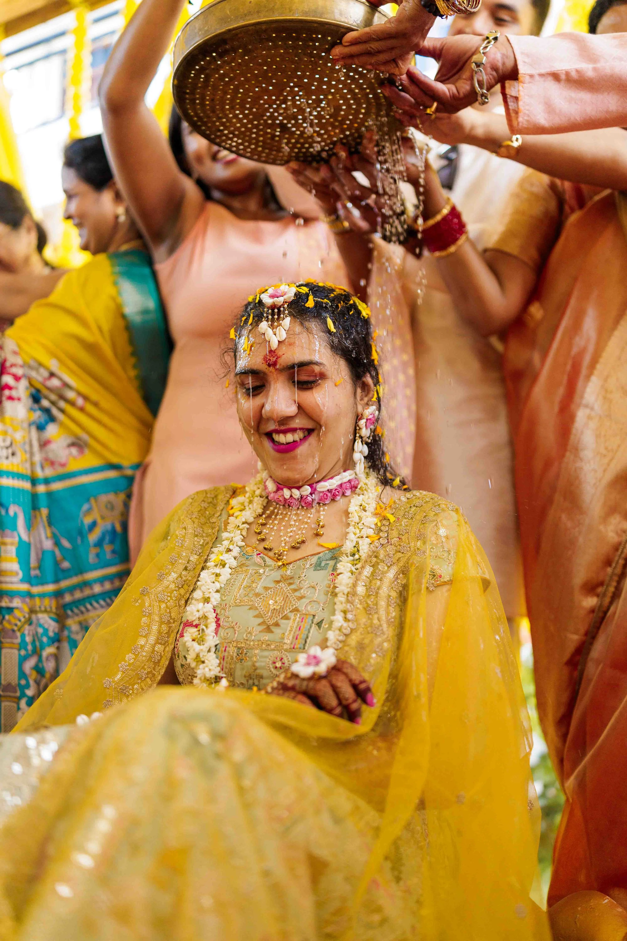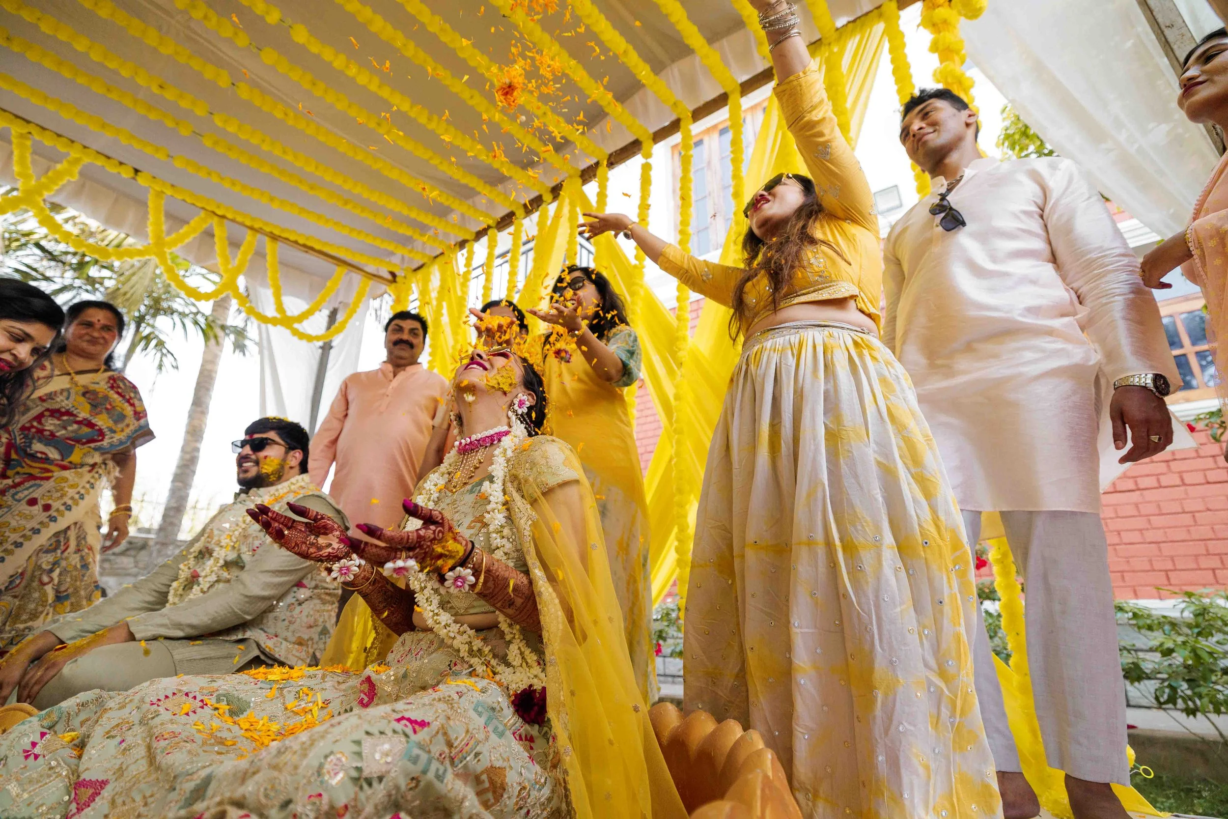 A Golden Day of Joy, Captured by Moments From Heaven Celebrating playful traditions, radiant laughter, and love glowing in golden hues Amirtha and Shyam's Haldi ceremony was a vibrant embrace of both tradition and playful warmth. Dressed in sunshine-hued attire and surrounded by loved ones, the couple was showered with turmeric, laughter, and live celebration, each moment glowing with energy and affection. The decor, awash in marigold tones, set a dreamy scene, petals in the air, turmeric-smeared smiles, and families coming together in a shared moment of joy. As the Haldi paste was lovingly applied, every giggle and teasing glance felt like a promise of forever. Captured by Moments From Heaven, these images go beyond ritual, they transport you into the heart of a love story painted in gold, laughter, and memory.
