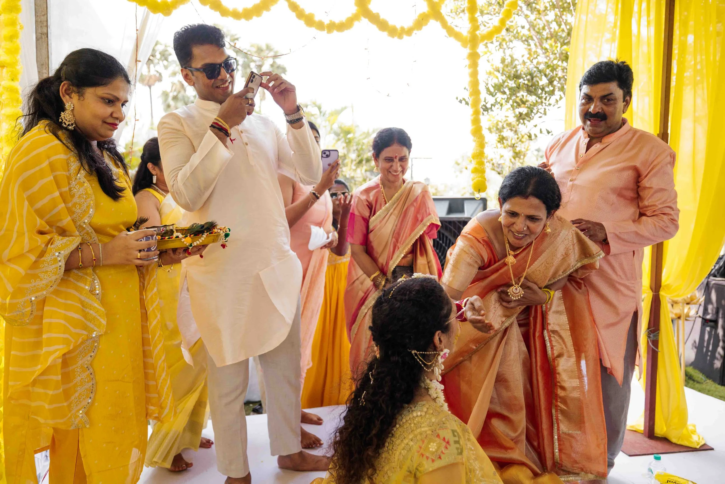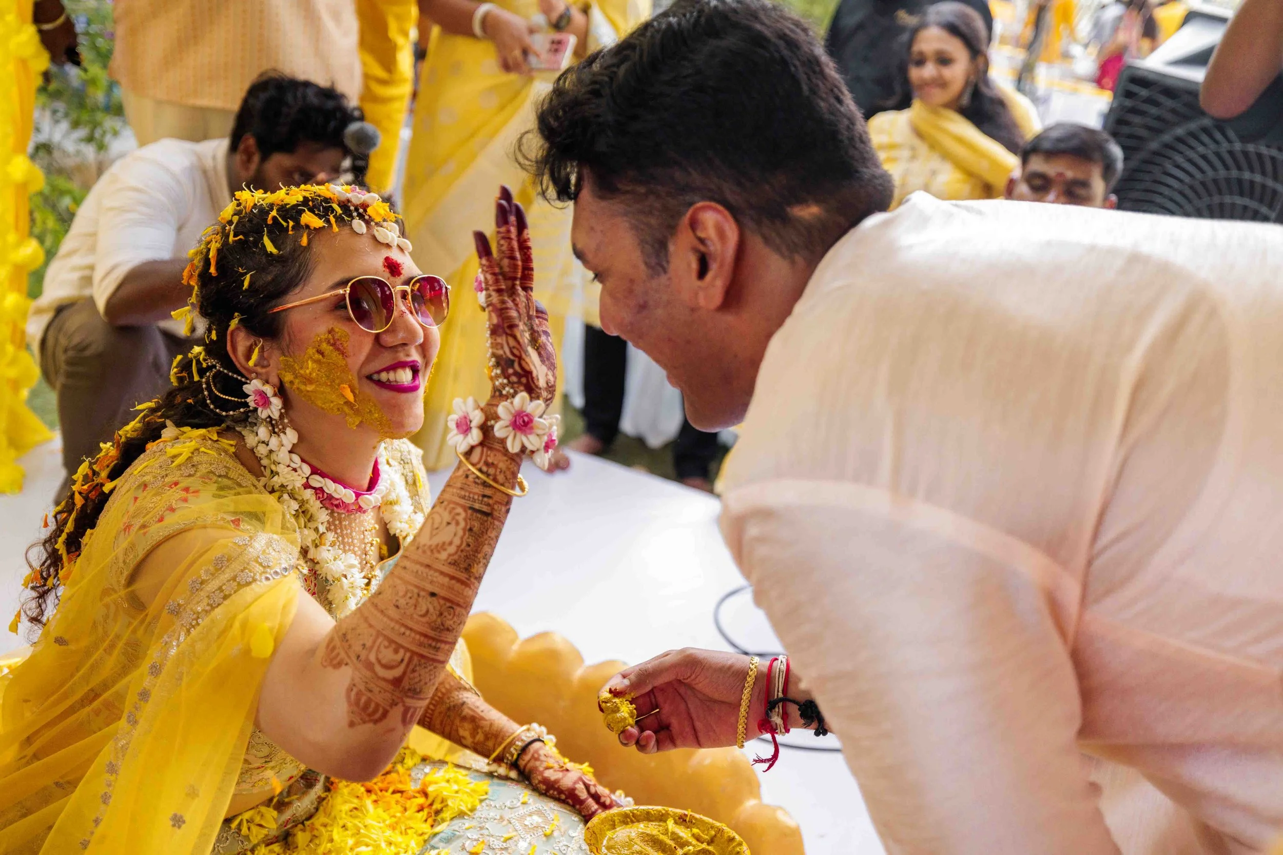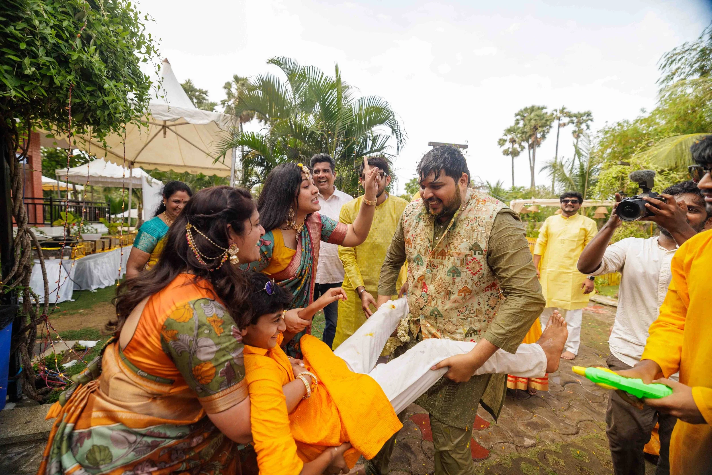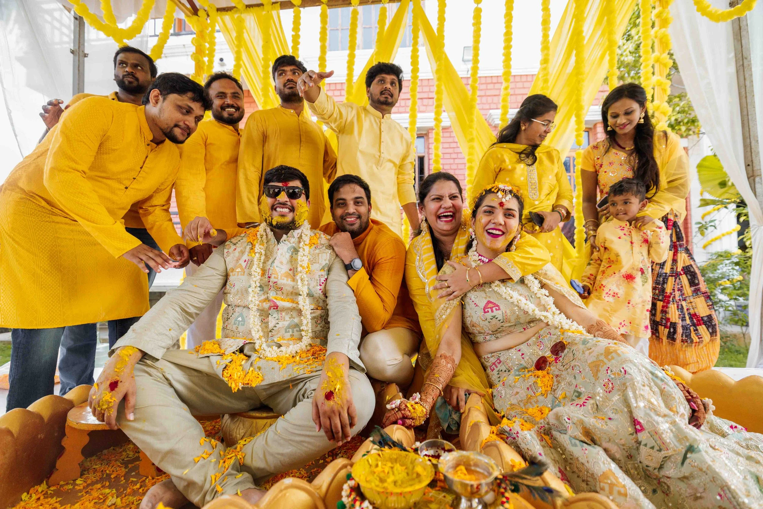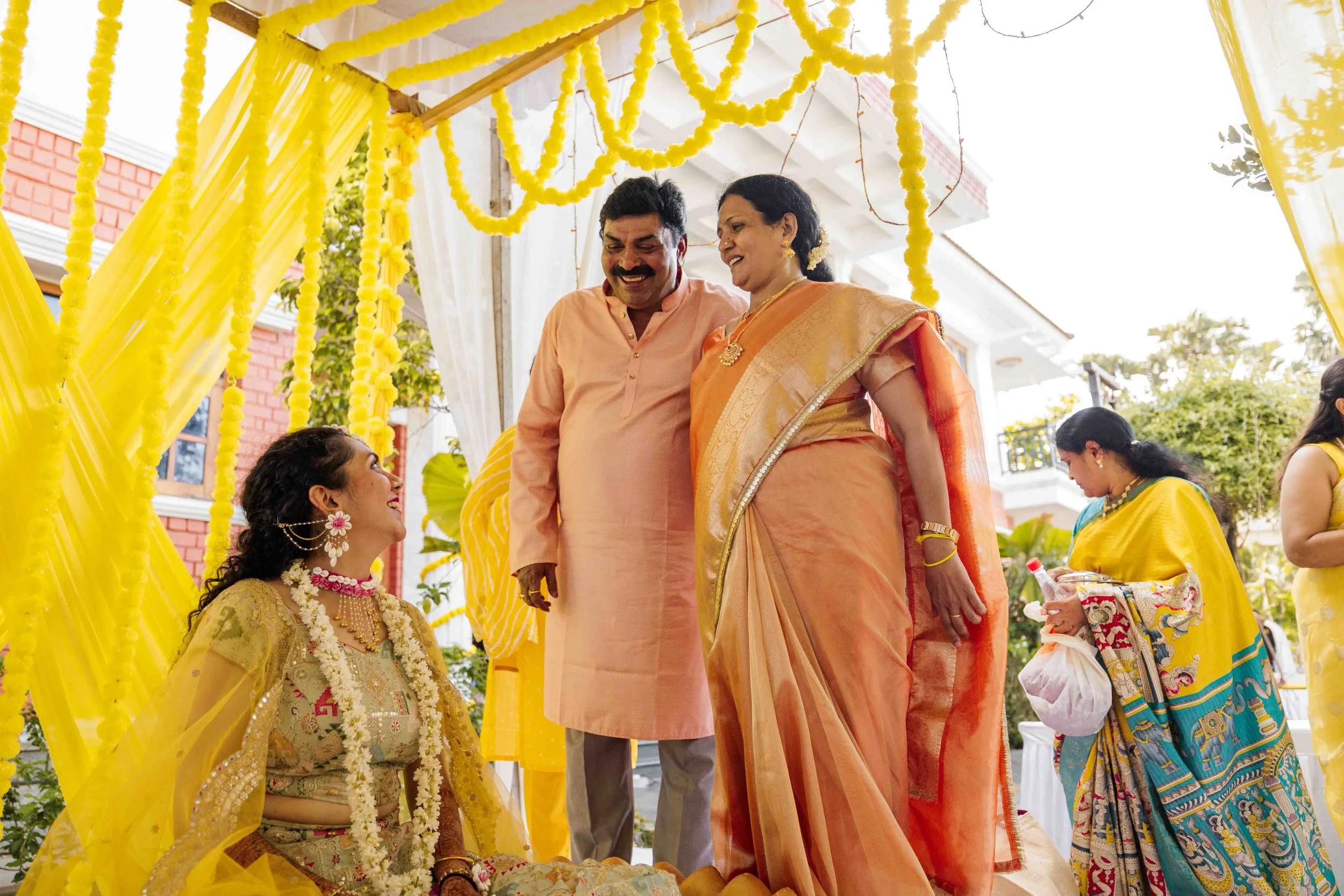 A Golden Day of Joy, Captured by Moments From Heaven Celebrating playful traditions, radiant laughter, and love glowing in golden hues Amirtha and Shyam's Haldi ceremony was a vibrant embrace of both tradition and playful warmth. Dressed in sunshine-hued attire and surrounded by loved ones, the couple was showered with turmeric, laughter, and live celebration, each moment glowing with energy and affection. The decor, awash in marigold tones, set a dreamy scene, petals in the air, turmeric-smeared smiles, and families coming together in a shared moment of joy. As the Haldi paste was lovingly applied, every giggle and teasing glance felt like a promise of forever. Captured by Moments From Heaven, these images go beyond ritual, they transport you into the heart of a love story painted in gold, laughter, and memory.
