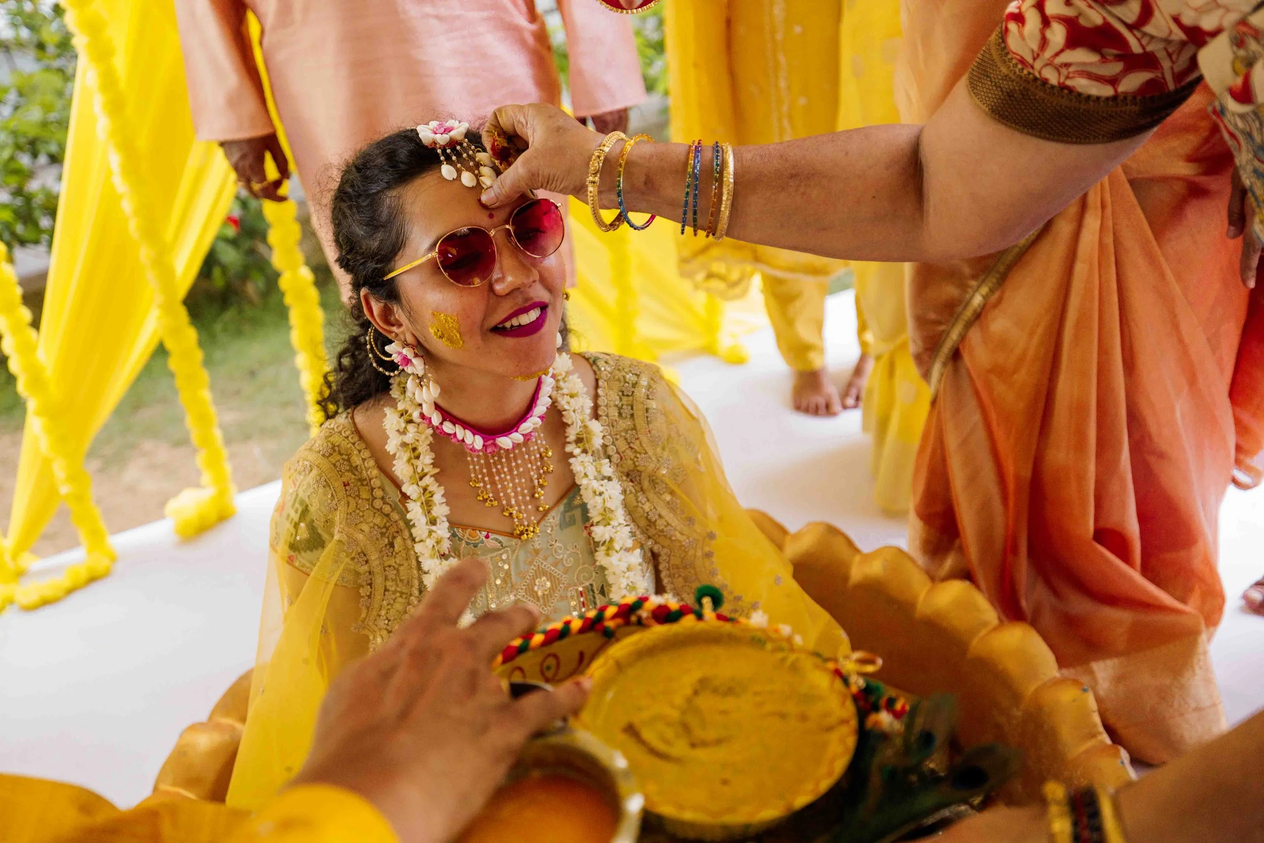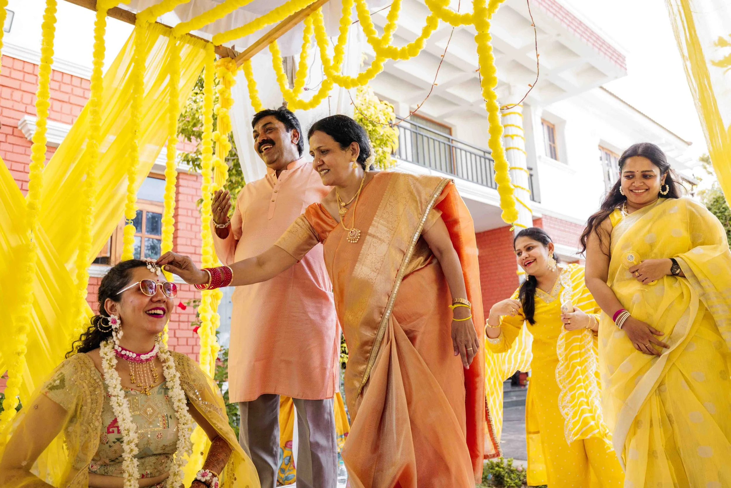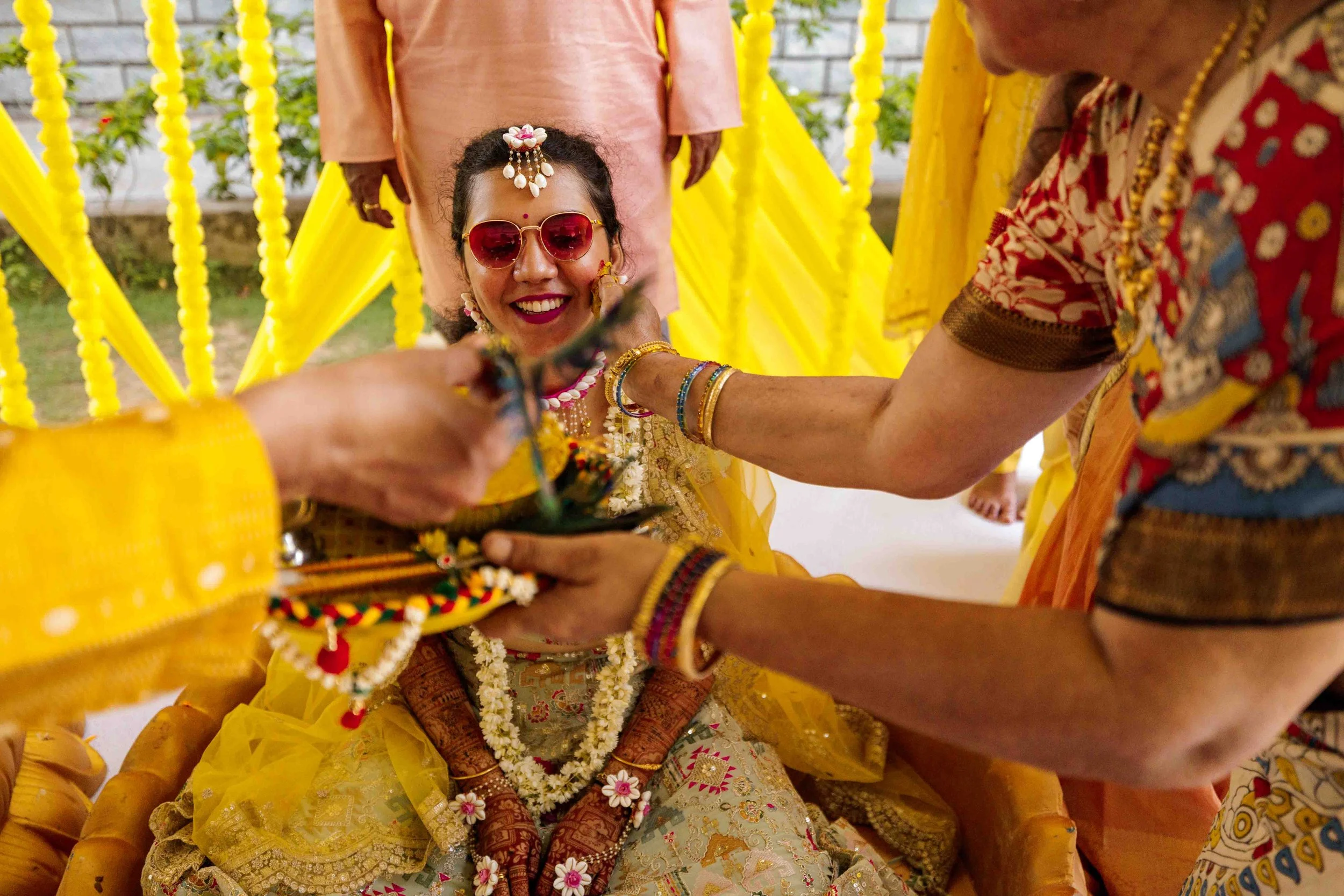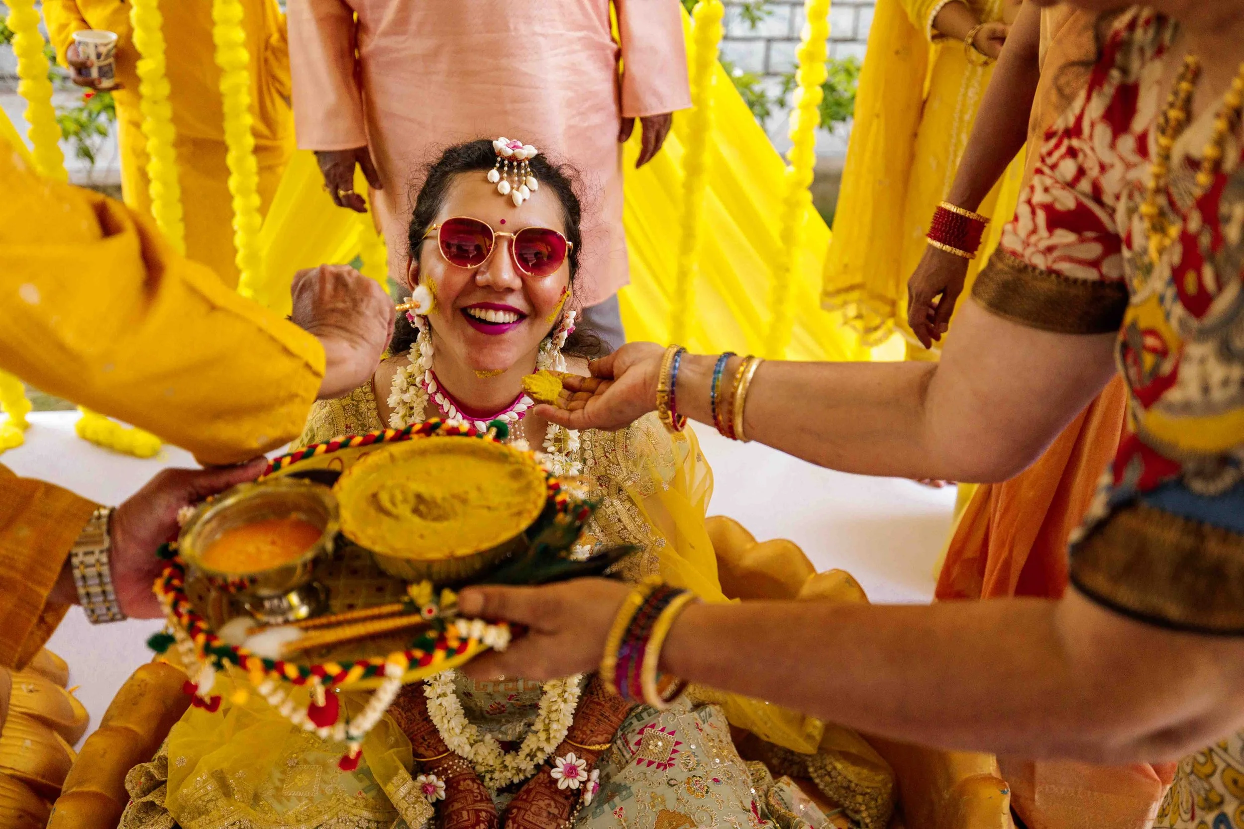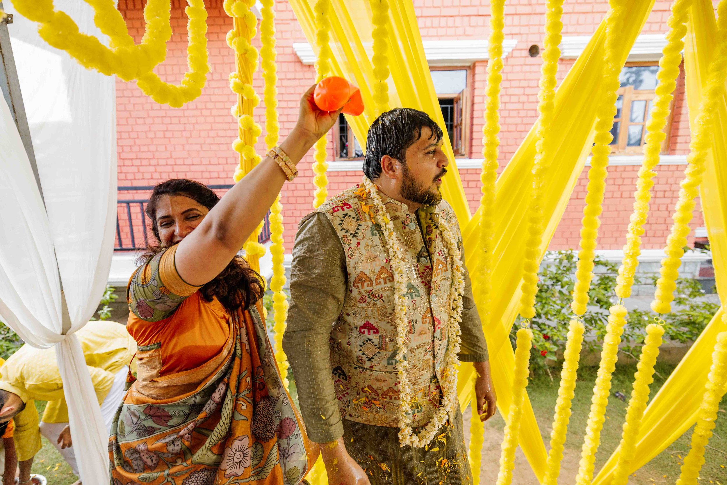 A Golden Day of Joy, Captured by Moments From Heaven Celebrating playful traditions, radiant laughter, and love glowing in golden hues Amirtha and Shyam's Haldi ceremony was a vibrant embrace of both tradition and playful warmth. Dressed in sunshine-hued attire and surrounded by loved ones, the couple was showered with turmeric, laughter, and live celebration, each moment glowing with energy and affection. The decor, awash in marigold tones, set a dreamy scene, petals in the air, turmeric-smeared smiles, and families coming together in a shared moment of joy. As the Haldi paste was lovingly applied, every giggle and teasing glance felt like a promise of forever. Captured by Moments From Heaven, these images go beyond ritual, they transport you into the heart of a love story painted in gold, laughter, and memory.